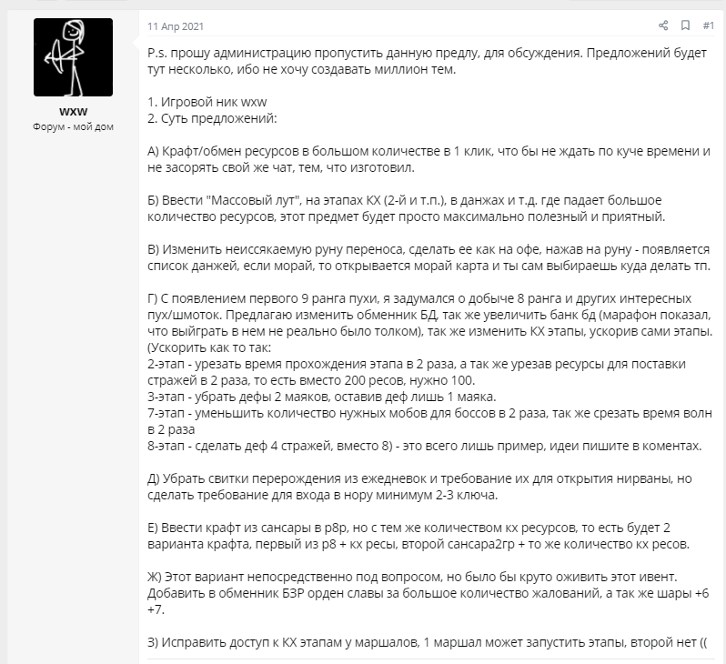 Ну прям порадовали, что прочитали предложку) интересно,что же изменят на на атн и бзр.. ну атн скорей всего кол-во мобов просто сократят и награду увеличат, а вот с бзр непонятно.. Возможно за набитые повозки будет даваться доп жалование, не знаю