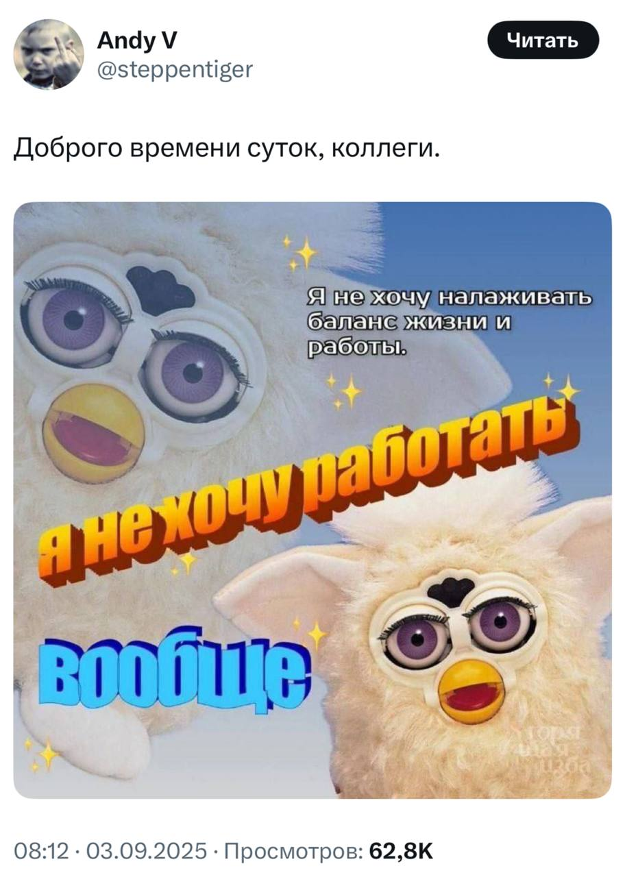 Всем доброе утро, кста! Если gpt без подписьки (20 евро за месяц плюс, они че там, жопу купюрами подтирают чтоли? Мажоры блин) сегодня меня не не подведет, то на вечер ждите от меня довольно забавный и милый прикол с участием меня и @8klair🐸 , в худшем случае завтра или в другой день, а остальные аналоги чата gpt меня не устраивают.