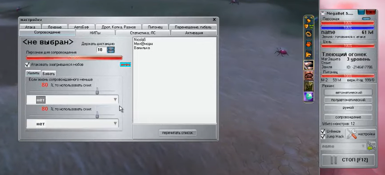 после того как немного постоял у его персонажей, он сразу же выключил программу и начал бить мобов сам, но персонажи бежать за ним продолжили, решать вам, сам ли он 6 окон за секунду прокликивает для атаки или это потусторонняя программа)