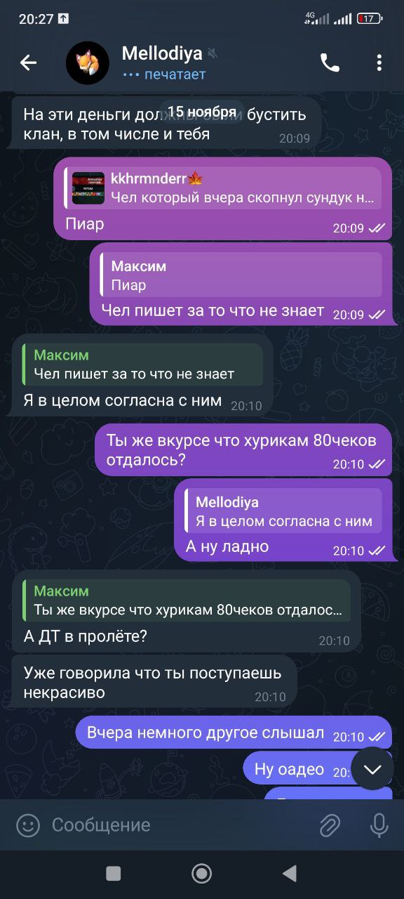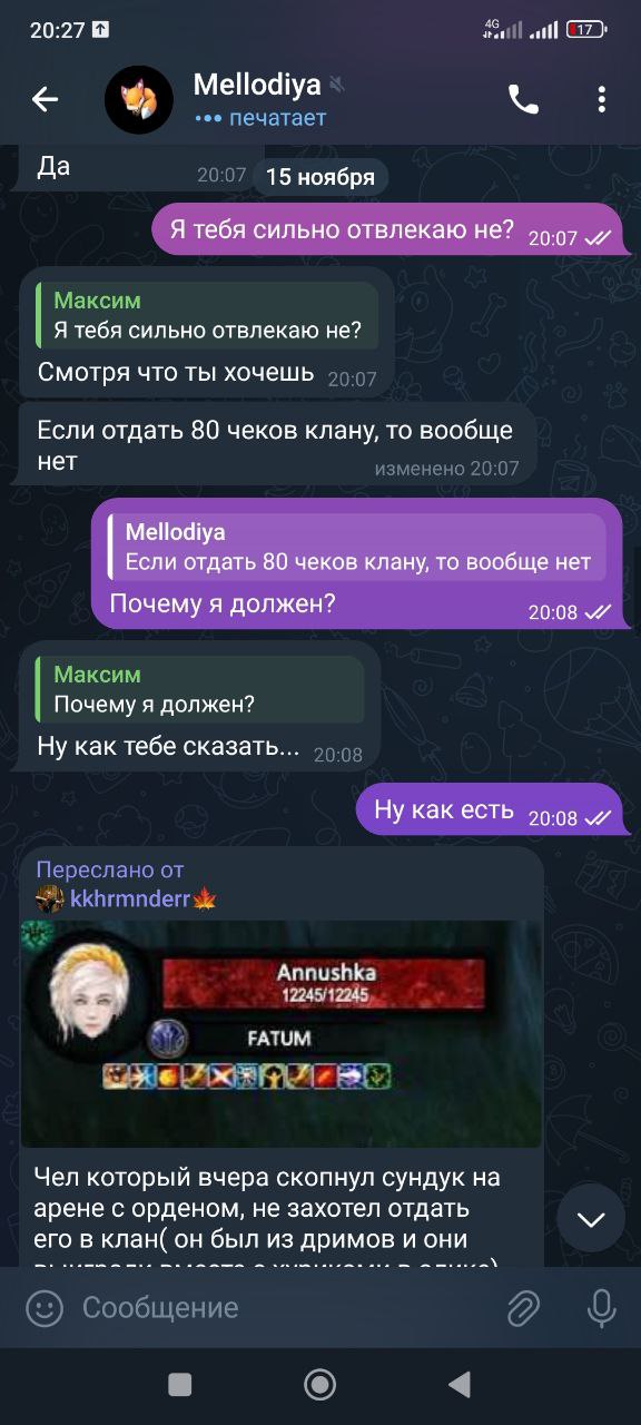 Кыдь все рассказал про орден, но вот ответ про кэшбек меня удивил, все это время слип говорил,что кэшбек это 10%, но когда Кыдь озвучивает что 20% (10 голдой и 10 реалом), я немного выпал в осадок. То есть SleepMen даже тут пытался обмануть, кланового офицера, с которым играет 2 года, и который всегда и всем ему помогает, взять элементарно этот сервер. Кто больше всех поднимает медийку DT ? "Annushka", кто бегает в течение дня и помогает сокланом убить боссов или что-то капнуть "Annushka", кто отвечает за кх заслуги и плит пачку "Annushka", кто фармит ресы и отдает их в клан перед гвг на 30% дешевле "Аnnushka", и когда возвращаясь от Кыдя я его спрашиваю во сколько ты оцениваешь мою работу в чеках за последние 3 серва и слышу 15 чеков ну извините, очень обидно становиться. Но даже с этой мыслью я пошел к клан лидеру хуриков и отдал им 80 чеков за этот орден, так же я отдал 10 чеков луку который меня пнул или талкнул на арене, и отдал 20 чеков мисту с DT который сутками играет как и я, и получает перед гвг хиру на ХП.Кто не верит можете попросить у админов профу, или спросить у мастера Хуриков. Оставив себе 50 чеков, кто то скажет это много кому то будет пофиг, но я считаю я справедливо оценил свое прибывание в DT, я не считаю клан плохим играет много классных людей которым я бесконечно желаю найти нормальный клан где их будут ценить по достоинству! С этим орденом SleepMen показал свое истинное лицо, что ему пофиг на людей который задротя и помогают клану и нужны ему только челики которые донатят, но в целом это понять можно ведь с его слов -: "PW это не игра для меня, а работа".