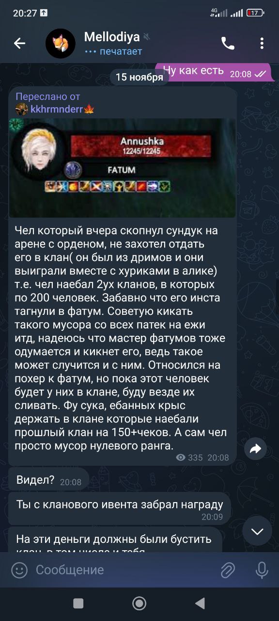 На что мне следует утверждение что это клановый орден и половину денег мы должны альянсу, сначала это меня взбесило с чего это мы должны половину, и почему это клановый орден, ведь вскопал сундук я практически один и не понятно как, магия. Поясню почему я не считаю орден клановым: 1- Клан не вложим в моего персонажа со старта сервера ни копейки, элементарная история на второй недели серва я попросил 2-е 10-ые рубинки, на что меня сначала игнорили, а потом сказали что они не падали, но когда я показал скрин с их передачей, мне сказали-:"ой а я их продал", с этого момента все мои просьбы сводились к просьбе вытащишь расходку из шопа за которую я скидывал деньги. 2- При мне разговора за то что это клановый ивент и весь дроп с него идет клану никогда небыло(ведь у слипа даже в фантазии не могло возникнуть что кто-то из тд капнет сундук), с таким же успехом можно весь дроп с осады скидывать на клан продавать и делить бабки, ведь все же на нее ходят, но получают что-то только избранные. 3- На предыдущей арене меня слили Хурики.