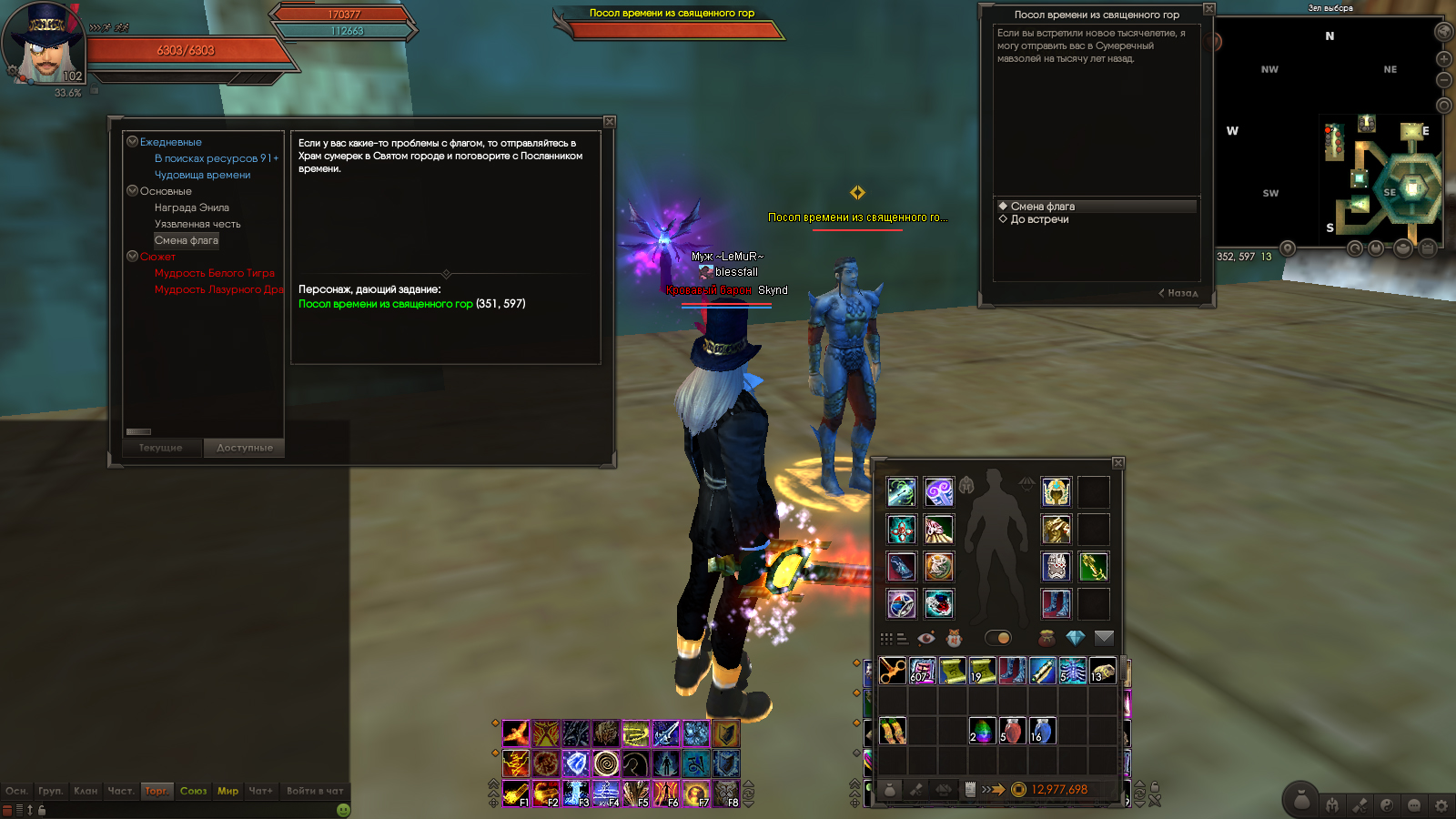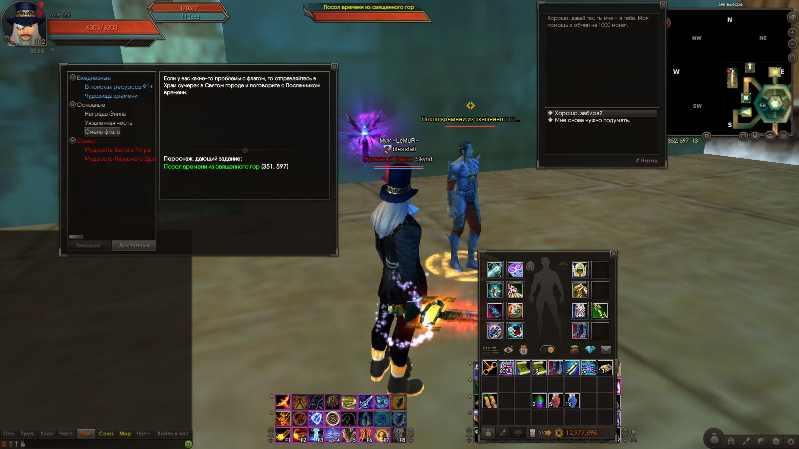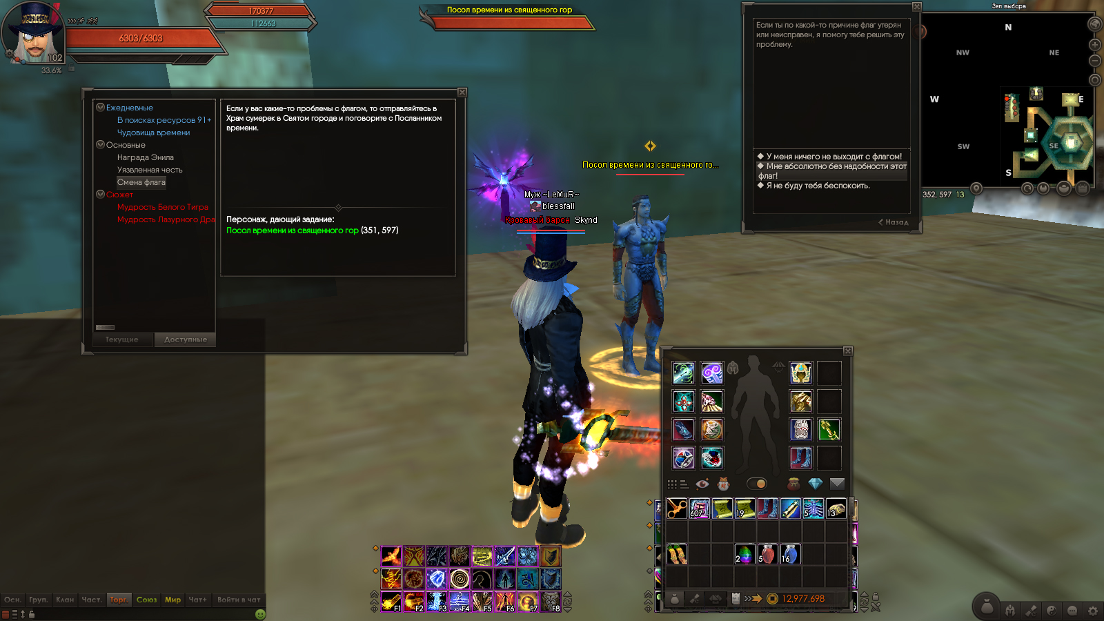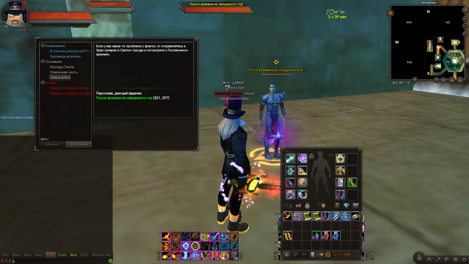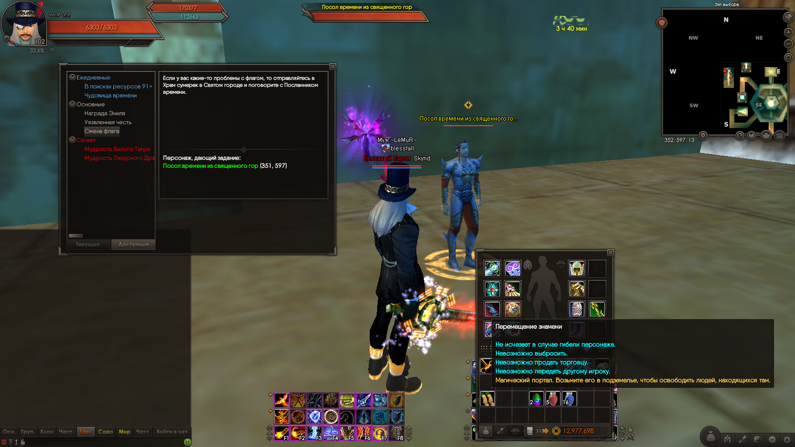 После завершения цепочки квестов для открытия доступа в 4 Хрономир в инвентаре остался предмет "Перемещение знамени" и по-прежнему доступен квест "Смена флага". Проблема заключается в том, что избавиться от этого предмета невозможно: использовать, передать, выбросить, продать его нельзя. Однако игрой предусмотрено (даже в гайдах по открытию Хроно написано про этот квест, т.е. он должен работать), что за 1000 монет предмет можно обменять у НПС "Посол времени из священного города", но появляется сообщение в системном чате: "Миссия недоступна". В приложении к теме находятся подтверждающие скриншоты в ХРОНОлогическом порядке :)
