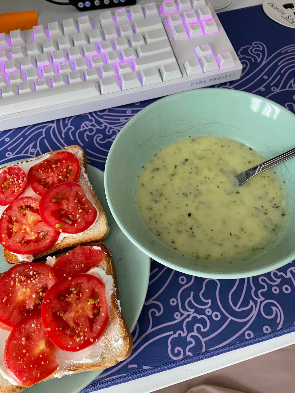 Подаем с тостом с творожным сыром и запеченным помидором с солью и чесноком. КУшаем.