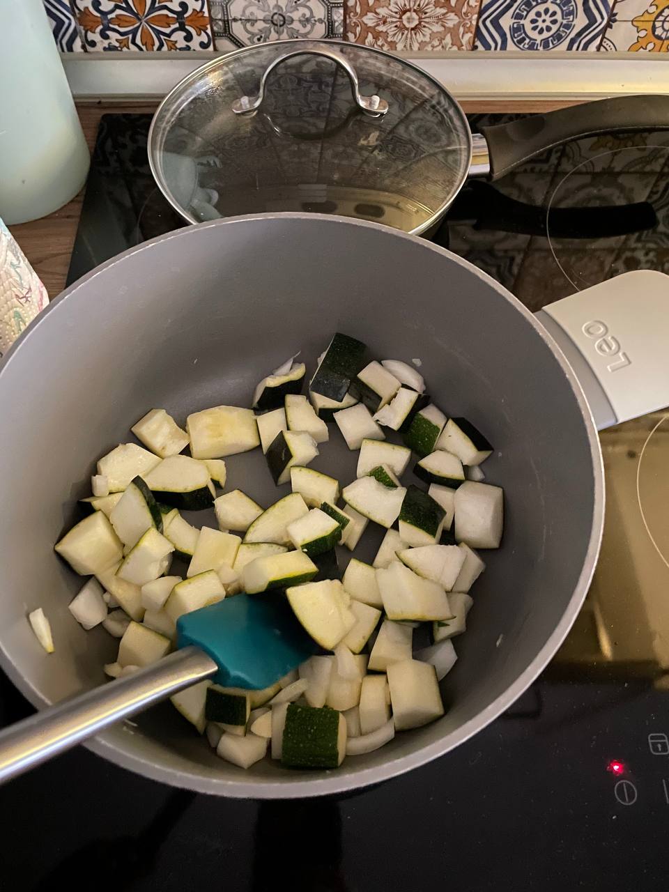 Режем кабачок с кожуркой, чистим от семечок, кидаем все это в сотейник(по мастер-шефовски) ну либо в кастрюлю\сковородку.