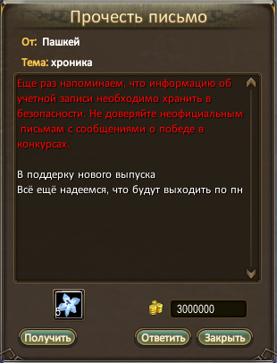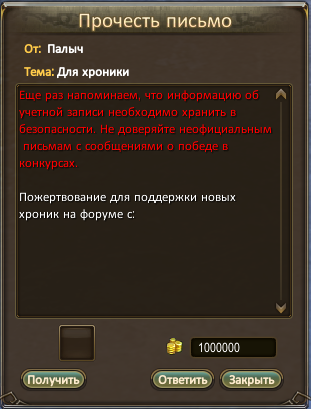 Напоминаю, если вы хотите помочь хронике - можете присылать почтой любую мелочь на ник Госпожа (все буквы русские), буду рада пожертвованиям на развитие хроник, скрины письма обязательно вставлю в выпуск <3