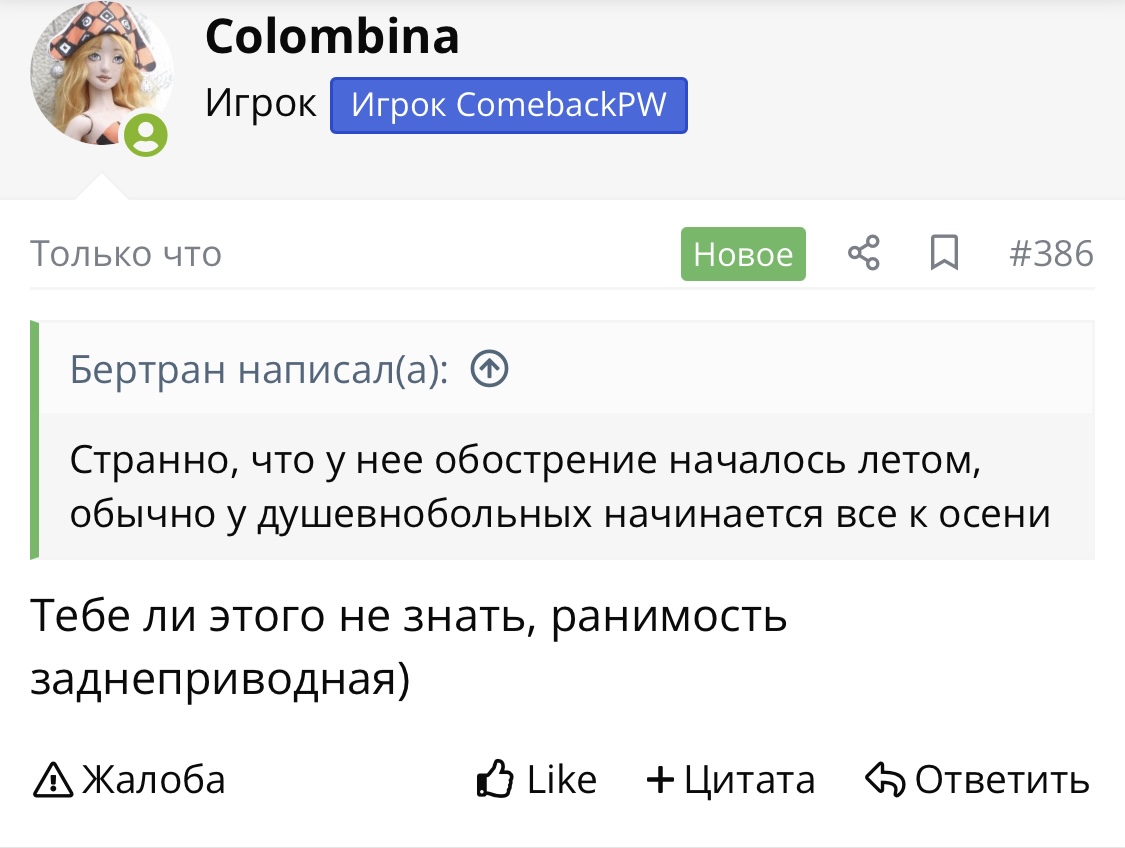 Кстати, че заметил. Она ни разу не регала новый аккаунт что бы ответить кому то, когда была в бане. Но как только появился Таугами - она это сделала, кекСтранно, что у нее обострение началось летом, обычно у душевнобольных начинается все к осени