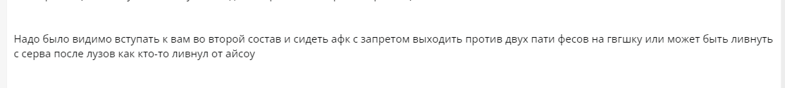 Надо было видимо вступать к вам во второй состав и сидеть афк с запретом выходить против двух пати фесов на гвгшку или может быть ливнуть с серва после лузов как кто-то ливнул от айсоу